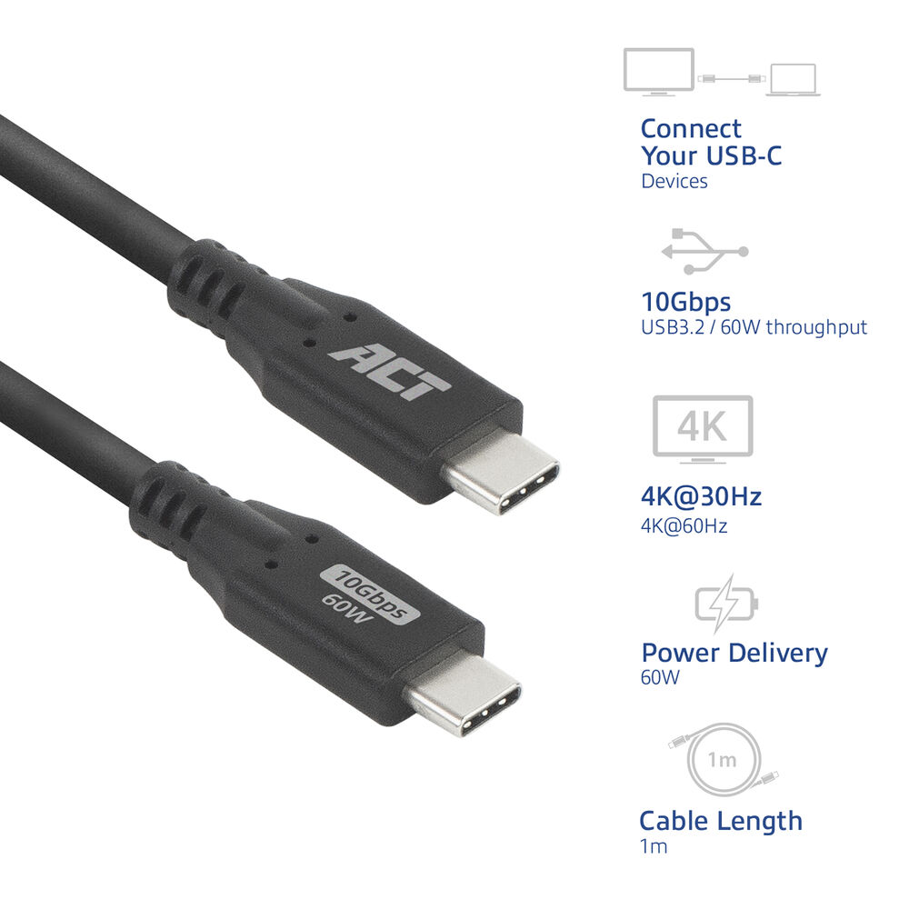 ACT | USB 3.0 Kabel | 10Gbps | 60W | USB-C naar USB-C | 1m | Zwart