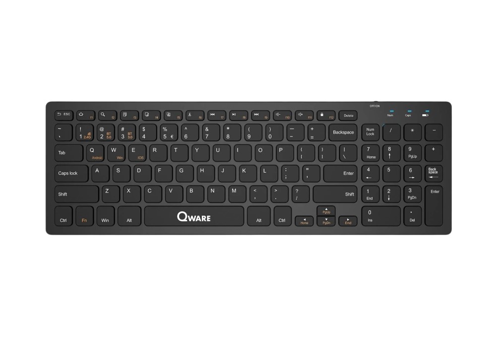 Het QWARE toetsenbord Oldham is een stijlvol en praktisch draadloos toetsenbord dat ontworpen is voor dagelijks gebruik. Met zijn slanke ontwerp en zwarte kleur past het perfect bij elk bureau en elke computer.